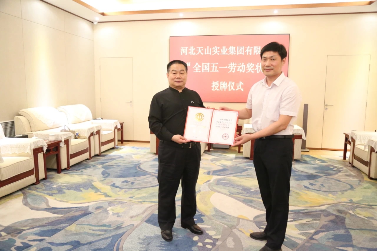 2021年7月13日,天山集团荣获“全国五一劳动奖状”授牌仪式隆重举行。中华全国总工会办公厅巡视员,督查室主任姜晓捷、石家庄市总工会副主席张宝山,经济部部长史跃华,石家庄高新区总工会主席于云川、部长张建东,以及全国总工会驻高新区总工会工作组景思詹、钟扬等领导一行应邀出席授牌仪式。天山集团党委书记、董事局主席吴振山、集团副总裁兼外事集团总裁王辉霞、集团综合办主任郑焕章、集团工会主席成国栋参加了授牌仪式。