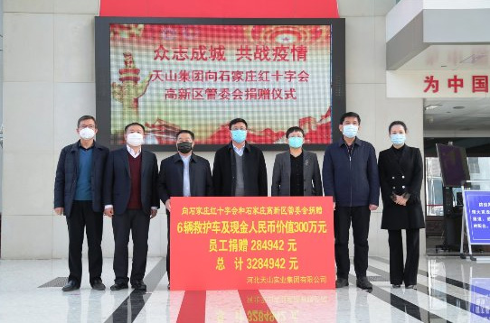 为坚决打赢新型冠状病毒疫情防控战,天山集团第一时间向石家庄市红十字会和石家庄高新区管委会捐赠六辆救护车及现金人民币价值300万元,员工自愿现金捐款28.4942万元,天山集团捐款总额已达328.4942万元及防疫物资。